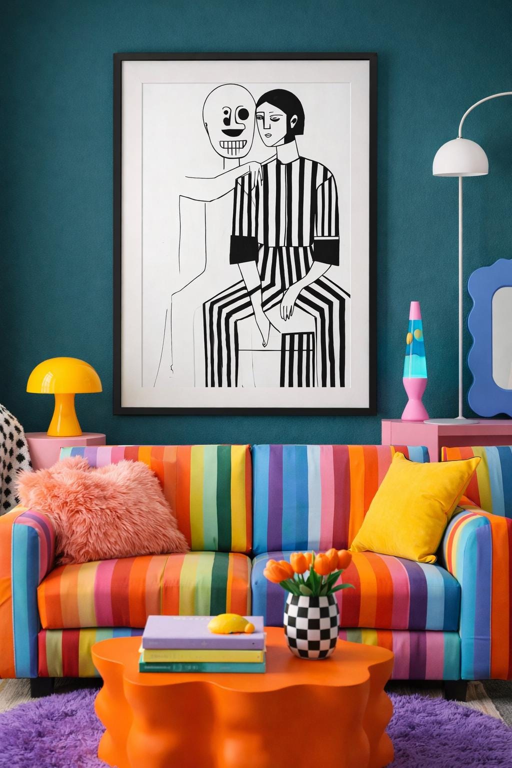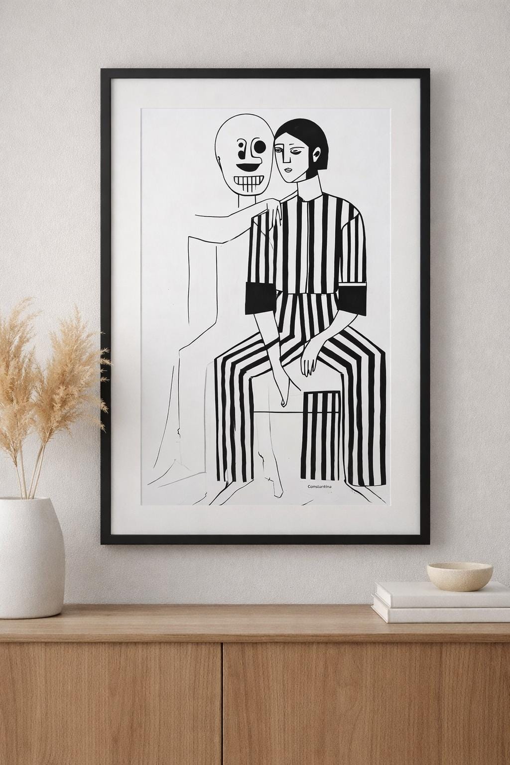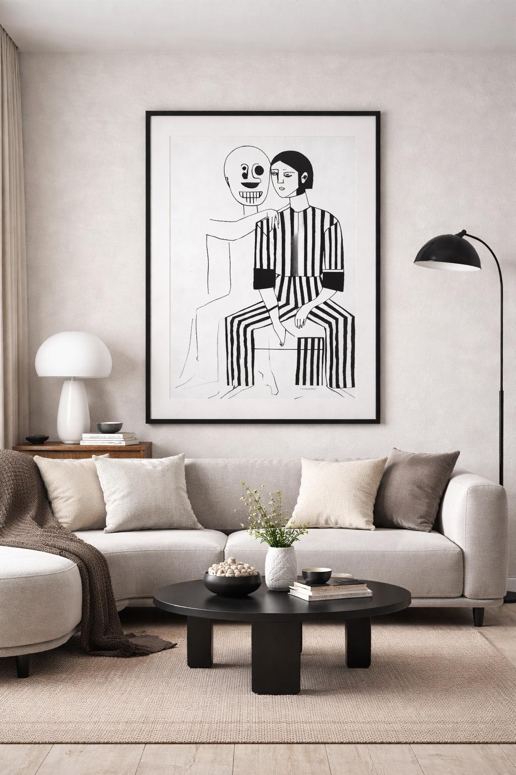 Discover the emotional depth of “Embracing Solitude,” an evocative illustration by Constantino. This striking artwork features a seated figure in a bold black-and-white striped outfit, exuding a calm yet contemplative aura. Complementing this character is an outlined figure with a skull-like face, its skeletal arm gently draped around the shoulders of the seated individual, creating a thought-provoking contrast. The minimalist style, defined by strong black and white contrasts, invites viewers to explore themes of internal conflict, companionship, and the complexity of human emotions. This piece serves as a conversation starter, perfect for those seeking to infuse their space with art that resonates on a deeper, emotional level.